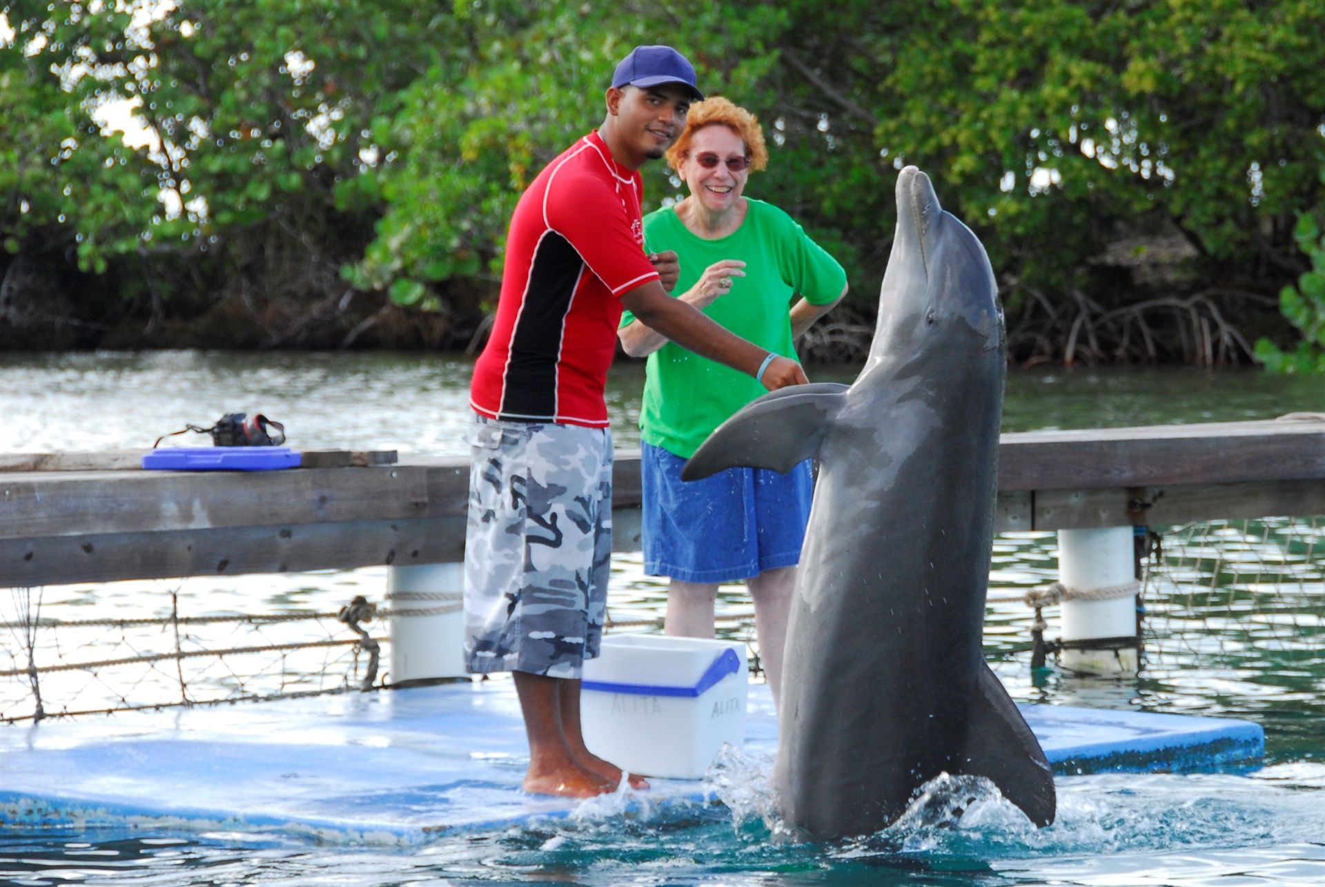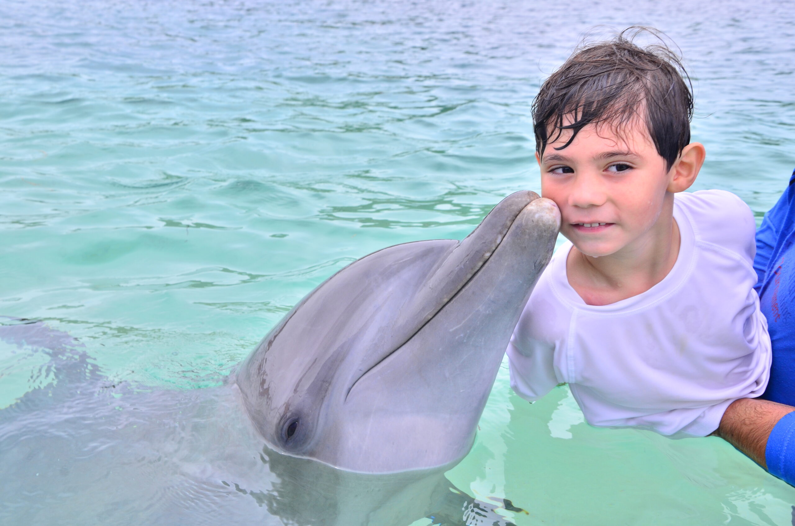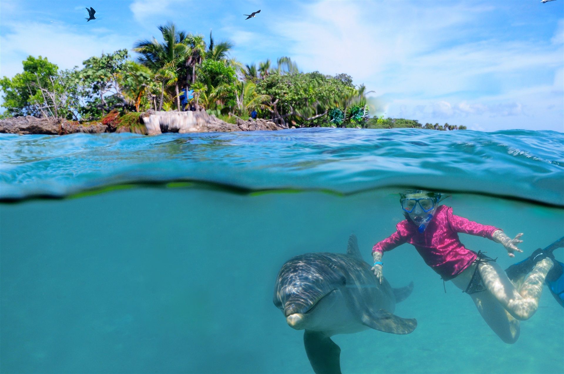The Dolphin Encounter begins as you travel across our lagoon to Bailey’s Key, one of two keys that make up Anthony’s Key Resort and the private home to a large family of Atlantic Bottlenose dolphins. At a beach-front cabana, you’ll receive a brief orientation and then you’ll walk along a white sandy beach to wade waist deep into the gin-clear waters of the Caribbean where a trained naturalists will give you a personal introduction to a resident dolphin. The trainer will describe the dolphins’ characteristics, anatomy and behaviors and will give you the opportunity to touch, kiss and play with a member of this friendly family of marine mammals. During the 30-minute encounter portion, you’ll have excellent photo opportunities in addition to professional photographs that will be taken of you and your new friends.
