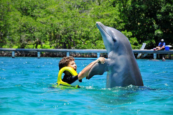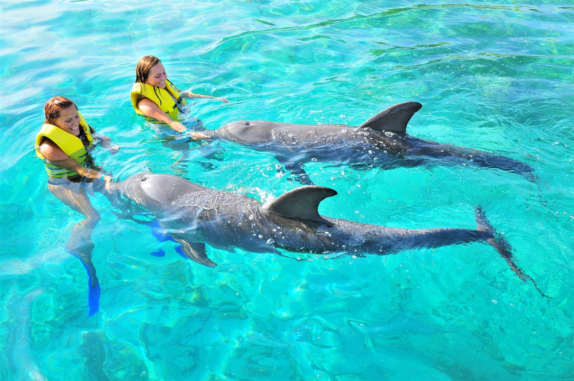 This dynamic 45 minute dolphin activity begins with a brief introduction to two dolphins, who will greet you on the platform with a handshake, a kiss, and a friendly smile. You’ll then enter the water for a playful swim to experience a thrilling “Footpush”, as the dolphins push you by the feet above and around the water’s surface, allowing you to feel their speed and strength! Then, take it easy on a ride around the lagoon, while holding on their smooth dorsal fins for the famed “Dorsal Ride”. In addition, they will amuse you with various water behaviors, vocal skills, tail splashes and applause.