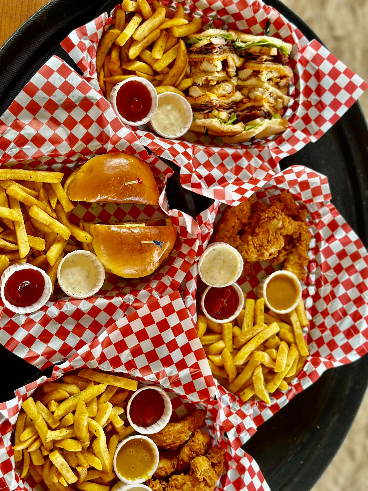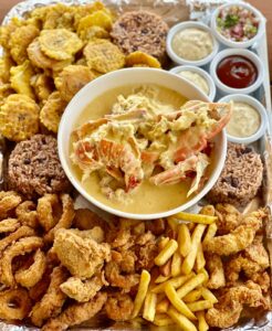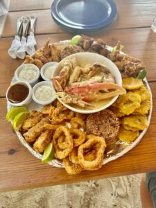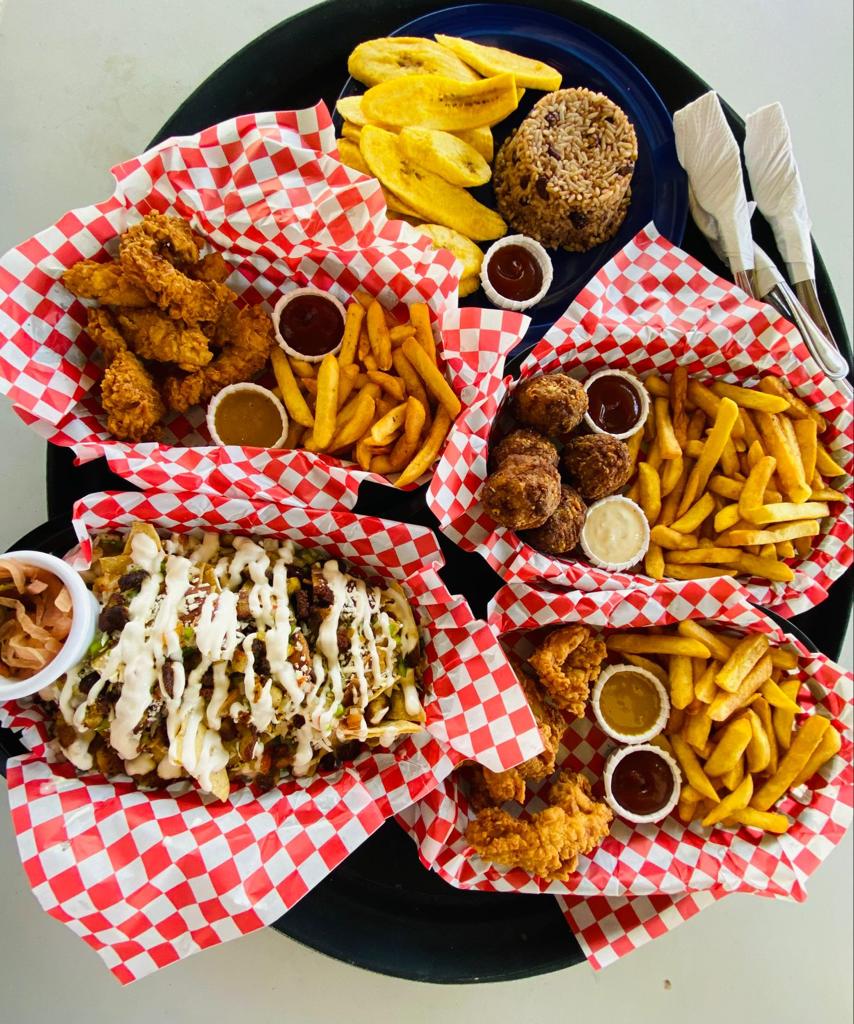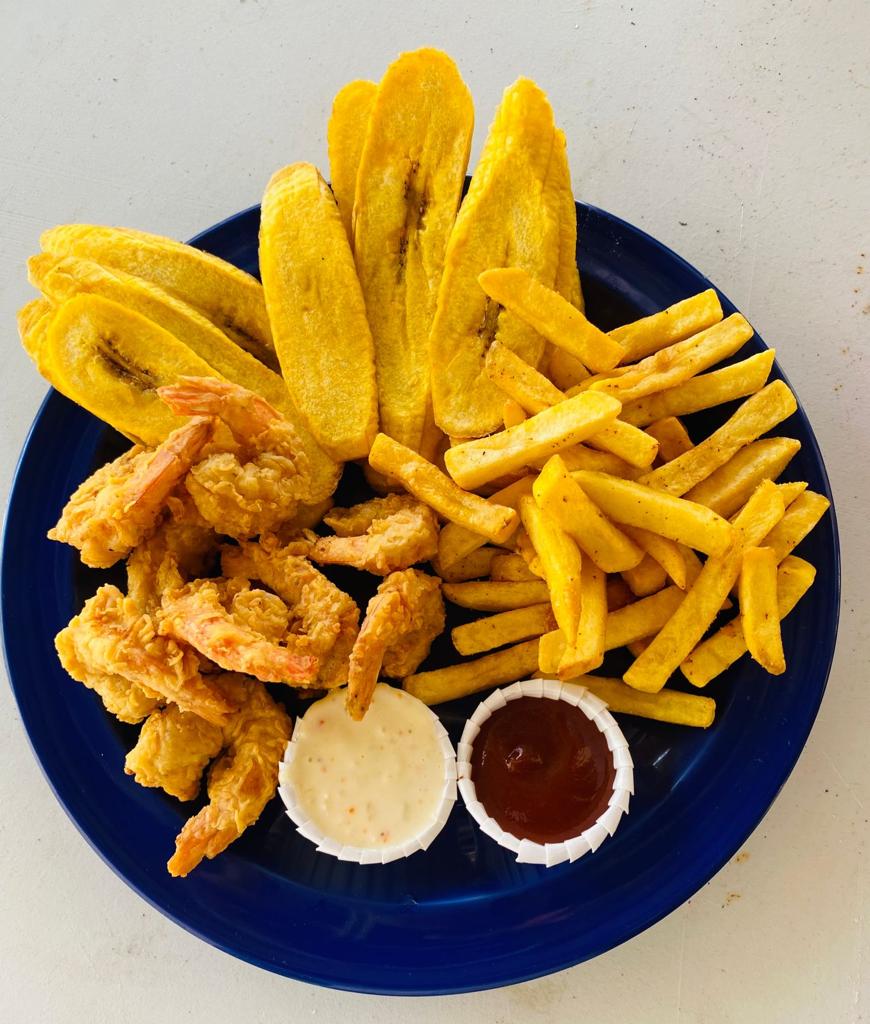 Lunch: Filet Chicken, Filet Fish, Rice and Beans-Island Style, Fried Plantains